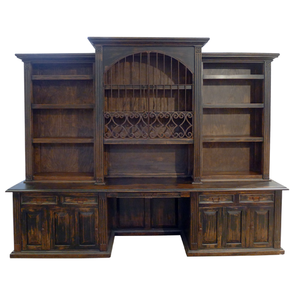 This antique finish handcrafted bookcase is a perfect blend of style and function, featuring a staggered geometric design that brings a classic, sophisticated look to any study or office. The top of the bookcase is beautifully adorned with crown molding, and the front is highlighted by an arched open area. This arched area is enhanced with forged iron bars, which terminate in graceful scroll ornamental ironwork, offering both structure and elegance.