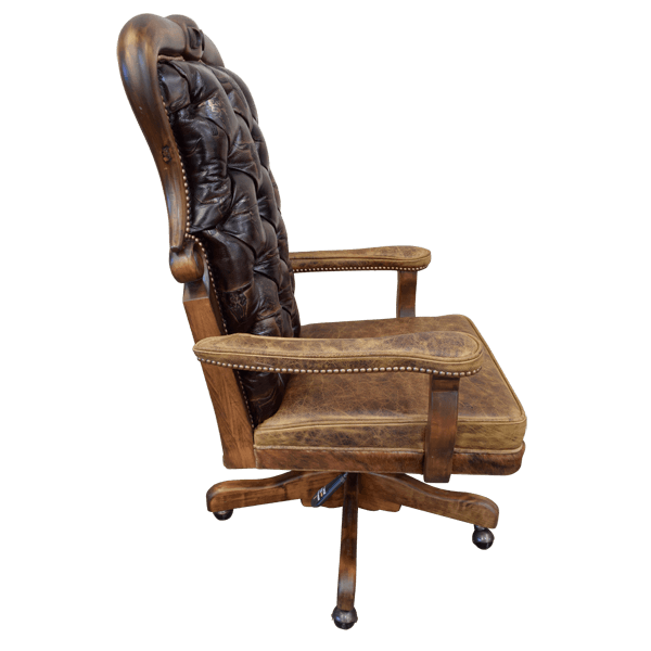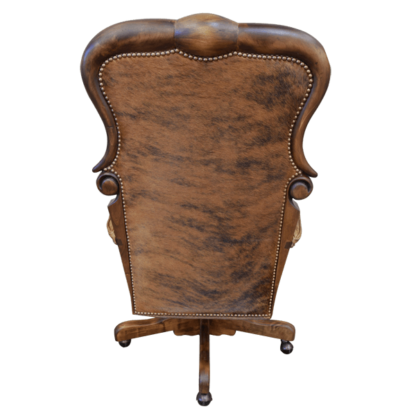 The chair’s swivel base is constructed from durable solid wood, with a hand-carved design that enhances its vintage appeal. Equipped with smooth-rolling caster wheels, it combines practicality with style, allowing easy mobility. Double-stitched leather ensures long-lasting durability, while precision-tacked accents with decorative nails add a refined touch. Perfect for adding a classic, timeless look to your office, this chair is both functional and beautiful.