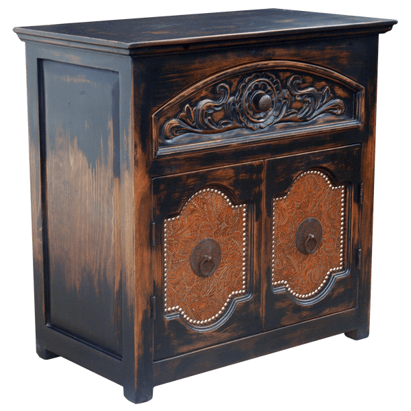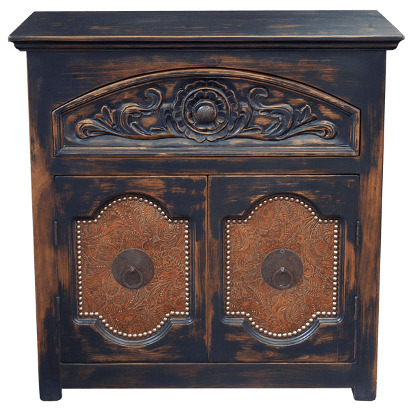 Completely customizable, this captivating antique nightstand can be tailored to your specific preferences, allowing you to personalize it to suit your decor style. Whether you’re furnishing a traditional, rustic, or hacienda-inspired space, this nightstand seamlessly blends functional furniture with artistic design. Its use of full grain leather, hand-carved details, and iron accents ensures it will be a standout piece in any home.