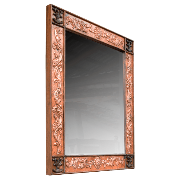 Introducing the Cobres Mirror, an exquisite piece that embodies sophistication and artistry. This elegant mirror features a sturdy wooden frame that is luxuriously covered in rich copper, creating a stunning visual appeal that captures attention. The intricate floral and spiral carvings adorning the frame showcase exceptional craftsmanship, adding depth and texture to the design.