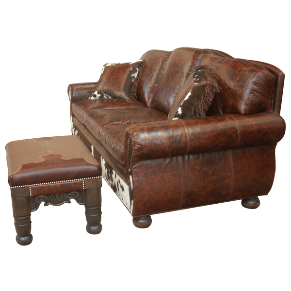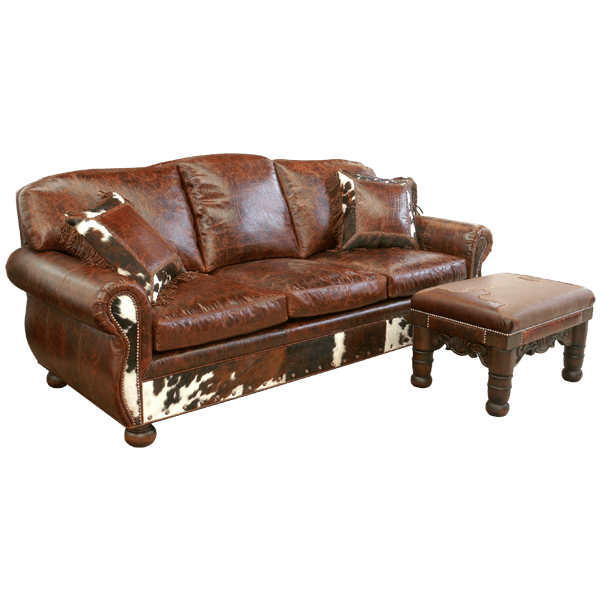 The sofa has a comfortable, wide seat with three, padded, loose seat cushions, and the cushions and the curved, padded armrests are upholstered in matching, earth colored, full grain leather. The front of each armrest, the reverse seat back, the exterior sides, and the lower front of the sofa are covered with contrasting, patterned cowhide, and the cowhide is hand tacked to the frame with gilt nails. The sofa rest on beautifully finished, hand turned feet, and the frame of the sofa is made with the best, sustainable, solid wood available. It is 100% customizable.