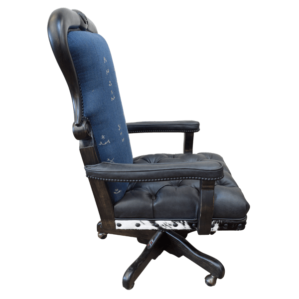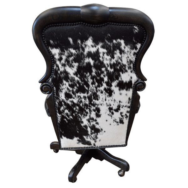 The seat is upholstered in premium black leather with an elegant tufted finish, exuding a sense of luxury while ensuring long-lasting comfort. The front of the backrest is upholstered in soft, durable fabric, while the reverse side is adorned with cowhide, creating a stunning and unique visual contrast. This combination of materials and textures adds a touch of sophistication to the chair’s design, making it a standout piece.