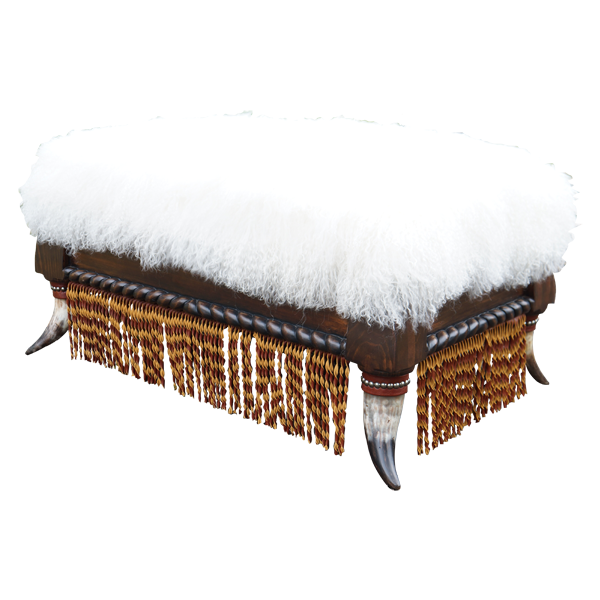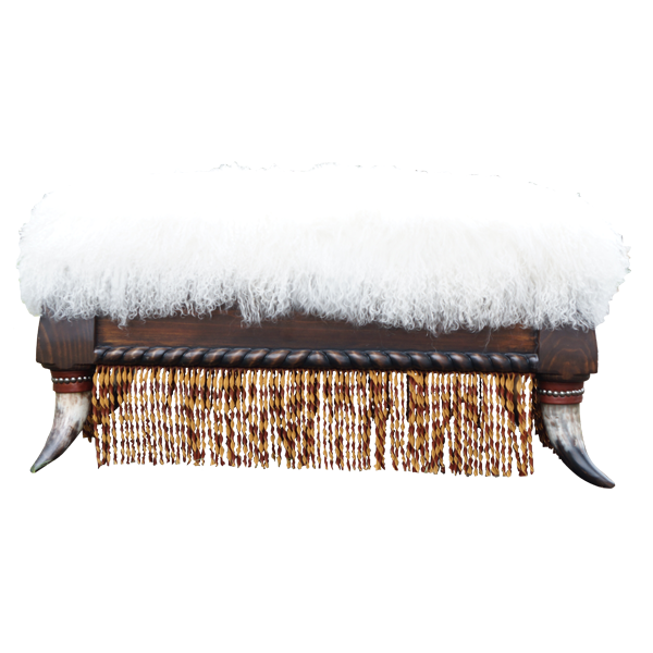 Add a touch of Western charm and elegance to your home décor with this handcrafted exotic upholstered ottoman. Featuring a unique design, the ottoman is upholstered with luxurious white Tibetan wool on its padded, rectangular seat cushion. The solid wood base is beautifully accented with a carved twist rope design, enhancing its rustic, Western appeal. Each side of the base is adorned with stunning leather fringe, adding texture and visual interest.