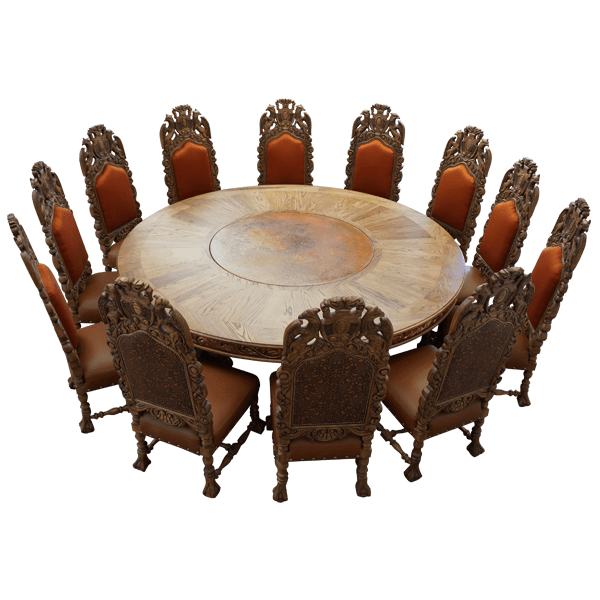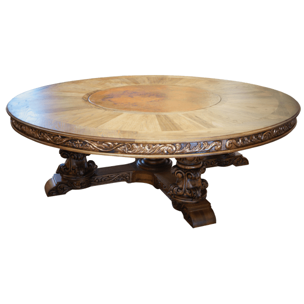 Transform your dining area into a statement of elegance with this exquisite table with copper accents, designed with opulent Baroque details. The table features a grand, wide, circular top, where its centerpiece is a stunning, hand-hammered copper panel. The copper is enriched with intricate hand-tooled floral patterns, offering a striking contrast to the smooth, richly finished solid wood that extends outward from the center.
