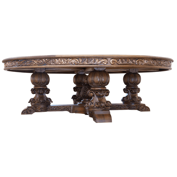 The pedestals are supported by robust, hand-carved, staggered feet, ensuring stability and elegance. Connecting the bases are lavishly carved crossbars, enhancing the table’s aesthetic appeal and structural integrity.