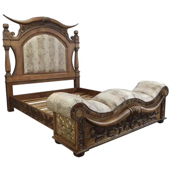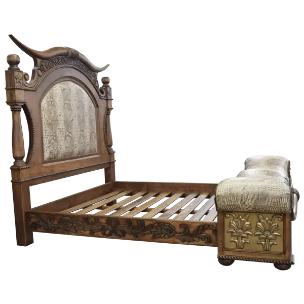 From its ornate carvings to its premium upholstery, this longhorn bed is made for those who demand excellence in every detail. It combines the warmth of natural wood, the sophistication of exotic leather, and the artisanal beauty of hand tooled copper into one extraordinary design.