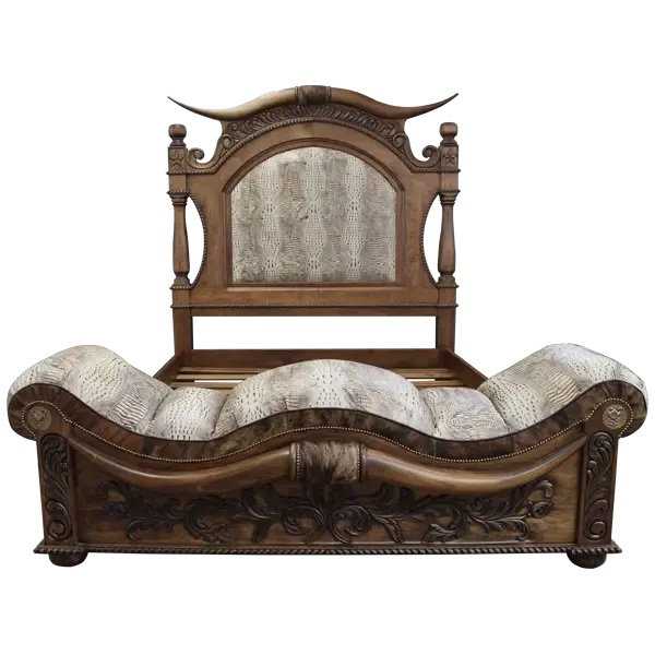 At the top of the headboard, spectacular hand carved horns command attention. These horns, symbolic of Western heritage, are wrapped in rich, brown patterned leather and secured with gilt nails for a bold decorative touch. Below them, the curved solid wood section is adorned with intricate floral and scroll carvings, creating a harmonious balance of texture and elegance. Every detail emphasizes the fact that this longhorn bed is both a work of art and a functional piece of luxury furniture.