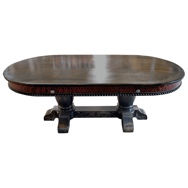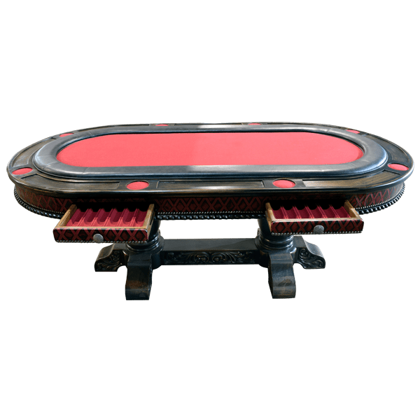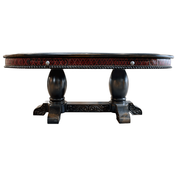 This luxury oval game table combines functionality and style, making it the centerpiece of any entertainment space. Crafted from solid wood, it features a rich dark finish that highlights the meticulous craftsmanship and carved details. The table’s oval shape is complemented by a decorative edge with intricate leather upholstery in red and black tones, adorned with nailhead trim for added sophistication.