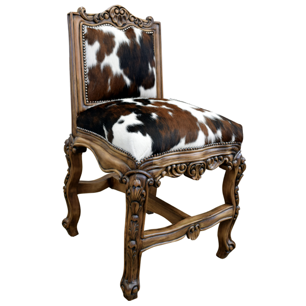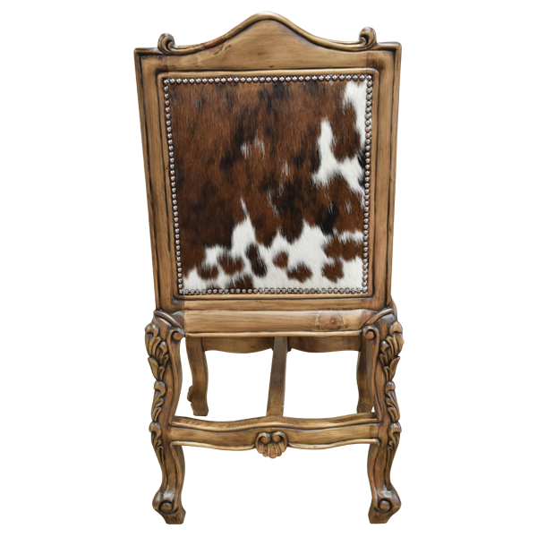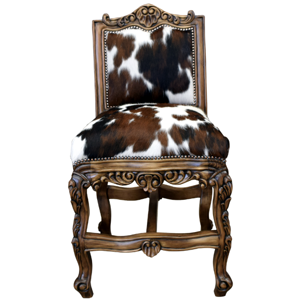 The seat, inside seat back, and reverse seat back of the Pinta Barstool are upholstered in luxurious patterned genuine cowhide, giving it a striking Western flair. This rich material not only enhances the visual appeal but also adds a layer of comfort that invites you to sit and enjoy. The Spanish colonial influences shine through in the stunning Spanish brown stain finish, which complements the overall design beautifully.