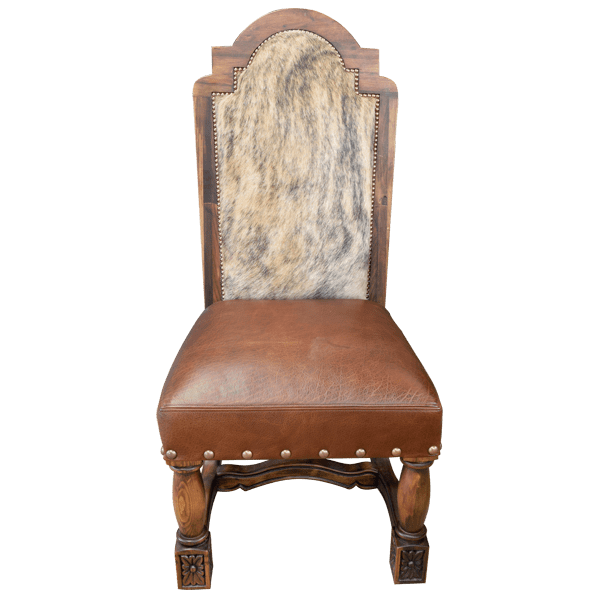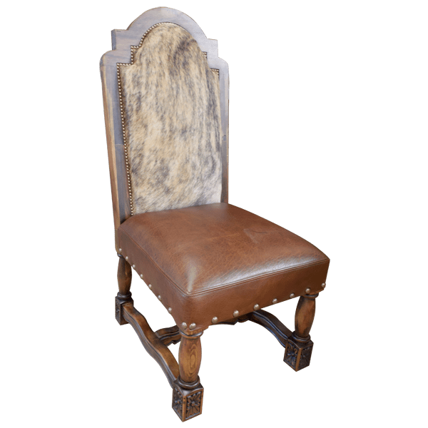 The sides of the seat are embellished with intermittently placed large gilt nails, creating a striking contrast against the rich textures of the leather and cowhide. These decorative elements contribute to the chair’s unique character, capturing the essence of Western style while remaining sophisticated. Each nail is strategically placed to enhance the chair’s overall design, making it not just a seating option but a work of art.