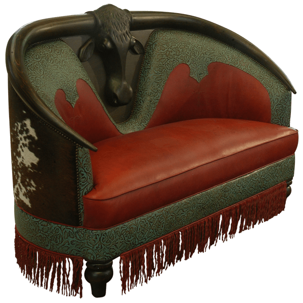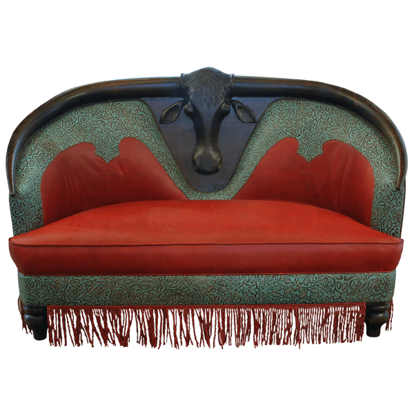 The sofa has a curved, “D” shaped seat back, and centered in the top of the seatback is a large, hand carved, long horn head with horns. The head is presented on an ebony finished, solid wood plaque, and small, dark, decorative nails border the plaque and the horns. Its ebony horns embrace the entire top of the seat back, and the horns flow downward to the end of the armrest. Adorning the upper, padded, front seat back, and following the contour of the carved head and its horns, is turquoise colored, patterned, full grain leather in a Western design. The leather continues downward and covers the front of the armrest.